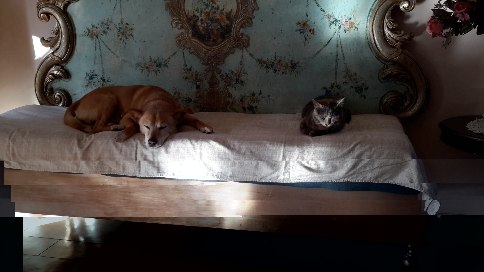Mayetta rovina la pace di Whisky che fa guardia all'osso (nascosto sotto la gola) e, da brava micia "malefica-che-conquisterà-il-mondo-come-tutti-i-mici", resta immobile lì ad osservarlo per ore e ore e ore e ore mentre lui, povero fessacchiotto come tutti i cani ("che verranno conquistati dai gatti!") si stressa per tutto il tempo :piangere: