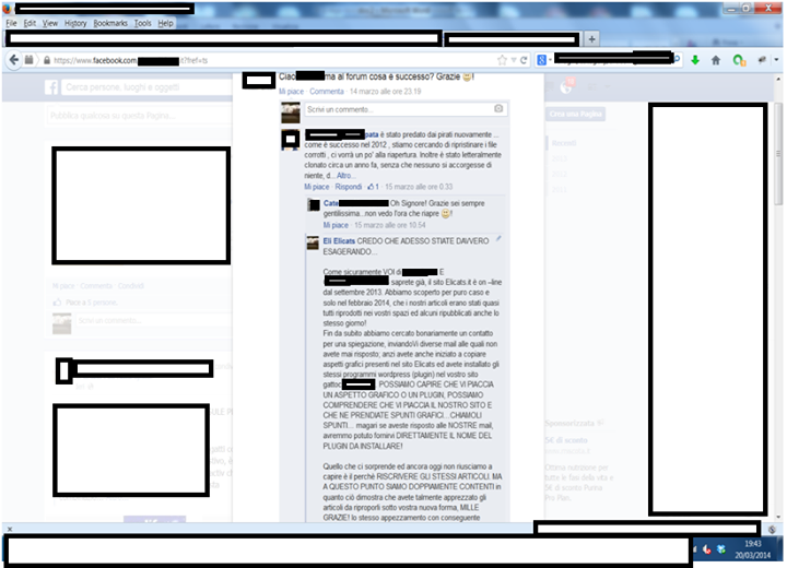 Fin da subito abbiamo cercato bonariamente un contatto per una spiegazione, inviandoVi diverse mail alle quali non avete mai risposto; anzi avete anche iniziato a copiare aspetti grafici presenti nel sito Elicats ed avete installato gli stessi programmi wordpress (plugin) nel vostro sito xxxxxxx. POSSIAMO CAPIRE CHE VI PIACCIA UN ASPETTO GRAFICO O UN PLUGIN, POSSIAMO COMPRENDERE CHE VI PIACCIA IL NOSTRO SITO E CHE NE PRENDIATE SPUNTI GRAFICI…CHIAMOLI SPUNTI… magari se aveste risposto alle NOSTRE mail, avremmo potuto fornirvi DIRETTAMENTE IL NOME DEL PLUGIN DA INSTALLARE!